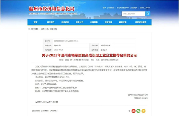 近日,溫州市經(jīng)濟(jì)和信息化局發(fā)布了《2022年溫州市領(lǐng)軍型和高成長型工業(yè)企業(yè)推薦名單》,決定推薦95家企業(yè)為2022年溫州市領(lǐng)軍型工業(yè)企業(yè),決定推薦202家企業(yè)為2022年溫州市高成長型工業(yè)企業(yè)。