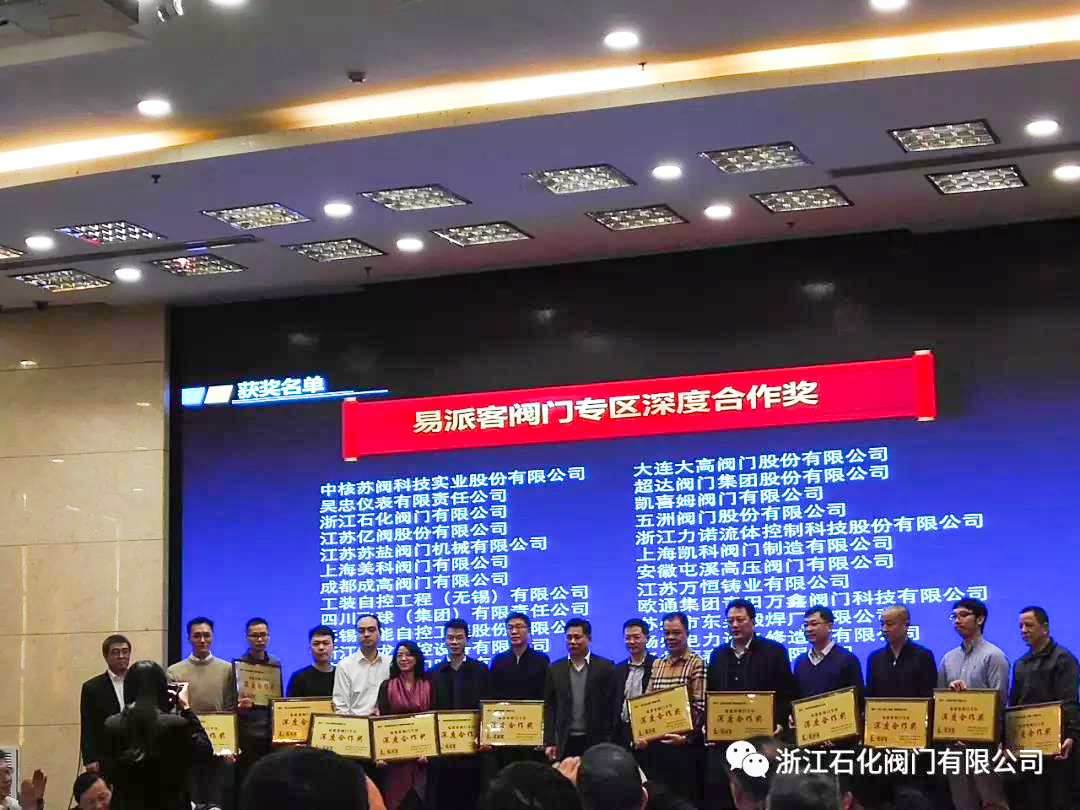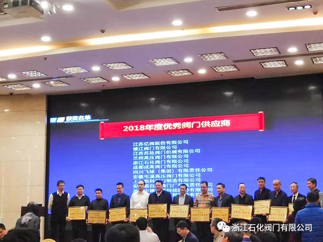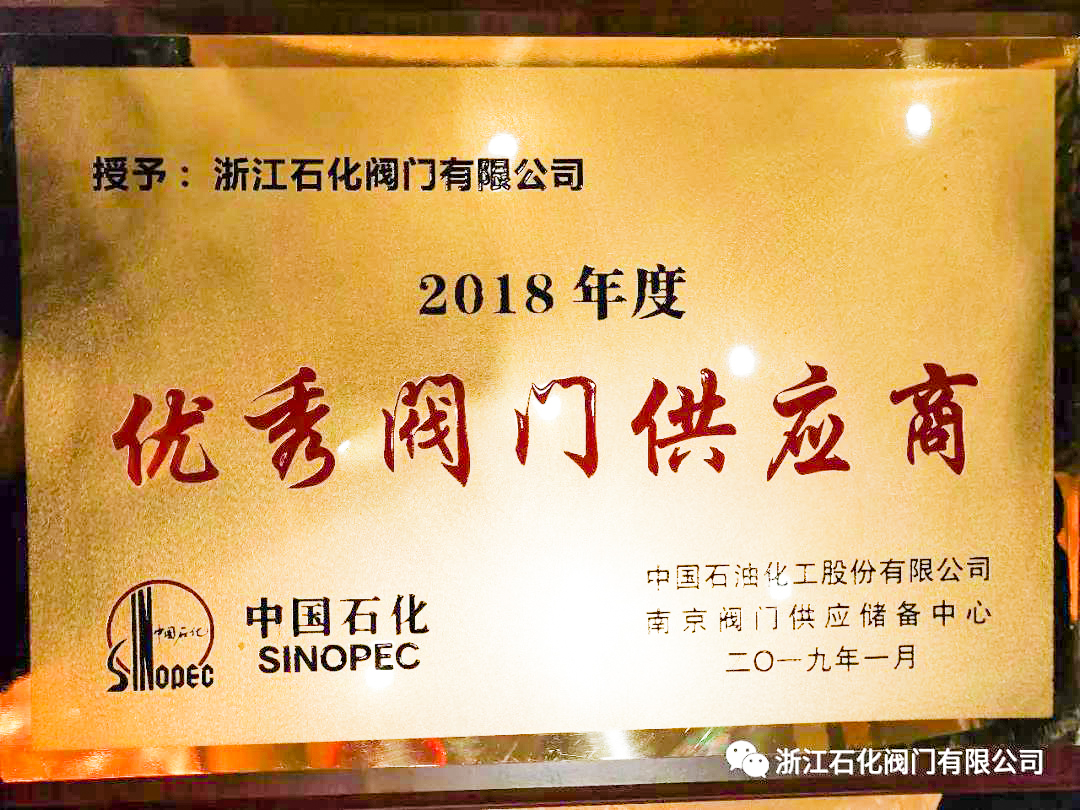 2019年1月11日,中國石油化工股份有限公司南京儲備中心、中國石化國際事業有限公司南京招標中心、中石化國際事業南京有限公司在南京組織召開易派客閥門專區推進會暨閥門供應商年度總結會。浙江石化閥門有限公司憑借過硬的產品質量、完善的服務體系榮獲了“2018年度中國石化優秀閥門供應商”、“易派客閥門專區深度合作獎”的兩項榮譽。該榮譽的取得,是中國石化對浙江石化閥門的充分認可。